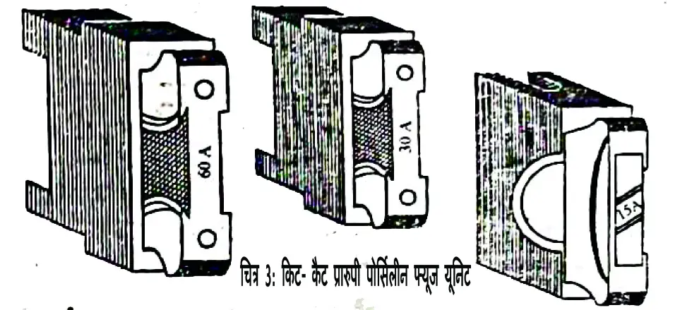6.किट कैट फ्यूज का फ्यूज होल्डर प्राय: विधुतरोधी पदार्थ पॉर्सिलिन का ही प्रयोग लें। यह दो भागों में विभाजित होता है। प्रथम भाग