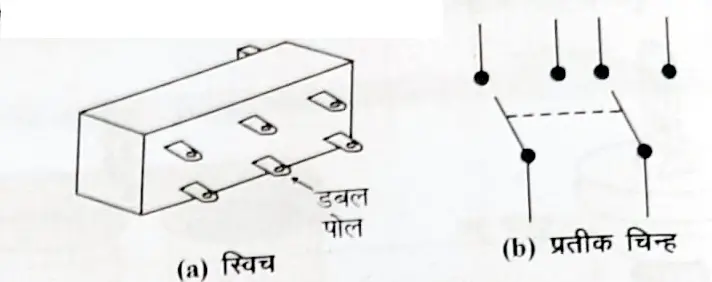 (iv) डबल पोल डबल थ्रो (DPDT) स्विच – इस प्रकार के स्विच में दो ऑन अवस्थाएं होती हैं। इसमें स्विच की दोनों आर्म या लीवर सम्पर्क बनाती हैं। इस प्रकार के स्विच को दो DPST स्विचों के सम्मिलित रूप की तरह प्रयुक्त किया जाता है। इस प्रकार के स्विच में छः टर्मिनल होते हैं।