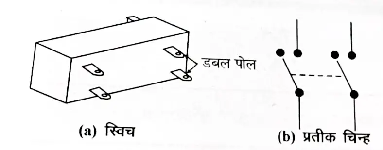 (iii) डबल पोल सिंगल थ्रो (DPST) स्विच – इस प्रकार के स्विच में केवल एक ही ऑन स्थिति होती है। इस स्विच द्वारा हम दो विभिन्न परिपथों को नियन्त्रित कर सकते हैं। इस प्रकार के स्विचों को SPST स्विच की तरह भी उपयोग किया जा सकता है।