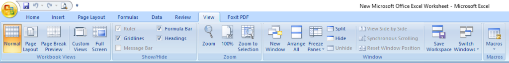 MS Excel 2007 में “View” टैब, आपकी वर्कशीट के प्रदर्शन को अनुकूलित करने और डेटा को विभिन्न तरीकों से देखने के लिए कई विकल्प प्रदान करता है। यह टैब आपको ज़ूम स्तर को बदलने, विंडो को विभाजित करने, फ्रीज़ पेन करने और मैक्रोज़ देखने में मदद करता है।